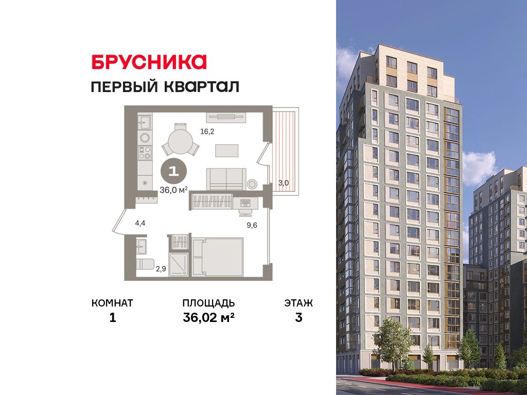 Квартира с кухней-гостиной и одной спальней в "Первом квартале". Особенности планировки: балкон, вид во двор, предчистовая отделка.