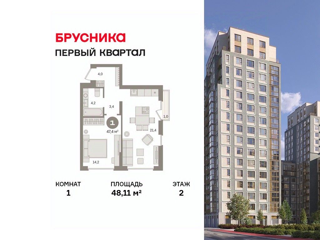 Квартира с кухней-гостиной и одной спальней в "Первом квартале". Особенности планировки: предчистовая отделка, французский балкон. квартиры в нашей базе: МТК04-Ж3.2.2.