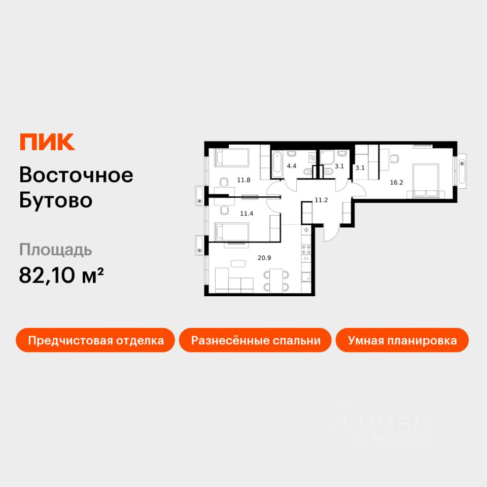 Продаётся 3-комн. квартира площадью 82,1 кв.м на 16 этаже 17 этажного дома (Корпус 48, Секция 1) проекта ПИК Восточное Бутово. Светлый просторный подъезд на уровне земли, функциональная планировка, большие окна, предчистовая отделка.