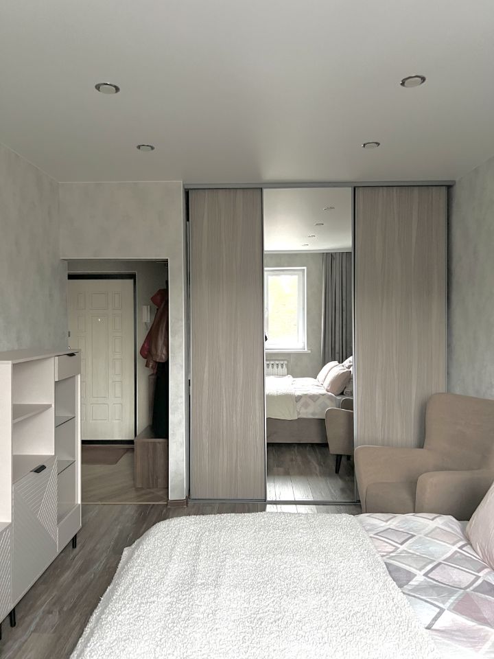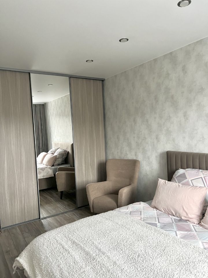 В комнате очень большая, вместительная гардеробная. Кровать с ортопедическим матрасом, для комфортного сна. Все остается будущим жильцам.