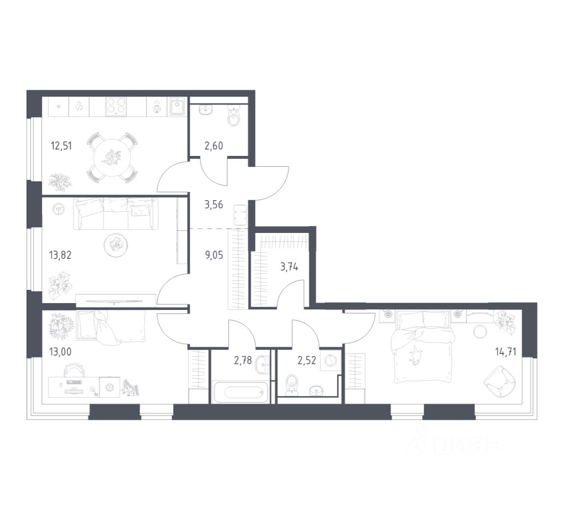 Строим кварталы для жизни с заботой о будущем. Предлагается 3-комнатная квартира комфорт-класса площадью 78,29 кв.м в корпусе 7.3 на 5-м этаже, в жилом комплексе "Богдановский Лес".