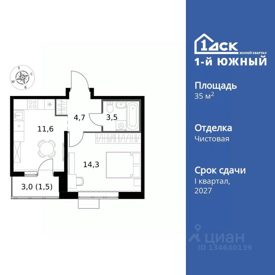 Продаётся 1-к квартира номер 136 общей площадью 35.6 кв.м. на 7-м этаже 24 этажного здания. Чистовая отделка.