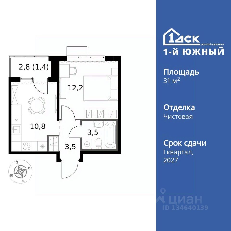 Продаётся 1-к квартира номер 172 общей площадью 31.4 кв.м. на 11-м этаже 24 этажного здания. Чистовая отделка.