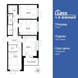 Продаётся 3-к квартира номер 157 общей площадью 79.2 кв.м. на 10-м этаже 24 этажного здания. Чистовая отделка.