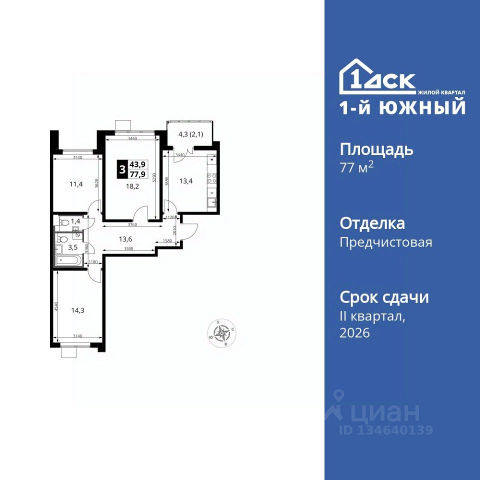 Продаётся 3-к квартира номер 691 общей площадью 77.9 кв.м. на 22-м этаже 24 этажного здания. Предчистовая отделка. Цена с учётом скидки.