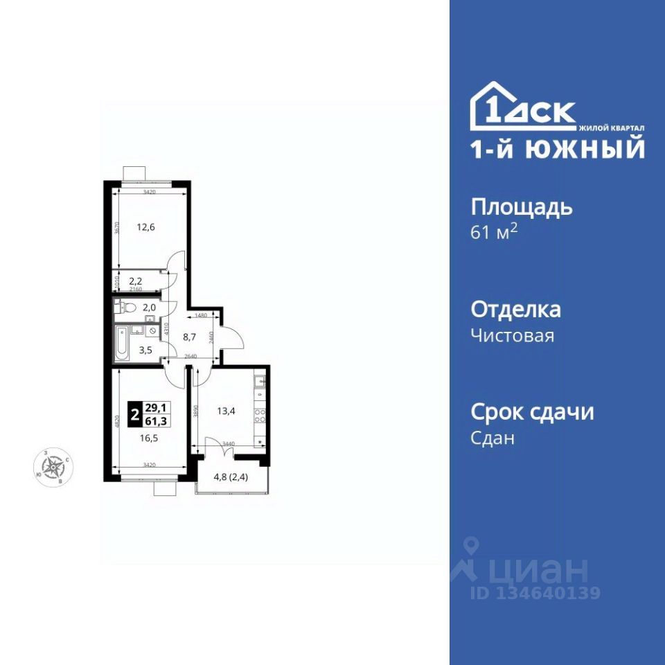 Продаётся 2-к квартира номер 486 общей площадью 61.3 кв.м. на 24-м этаже 25 этажного здания. Чистовая отделка. Цена с учётом скидки.