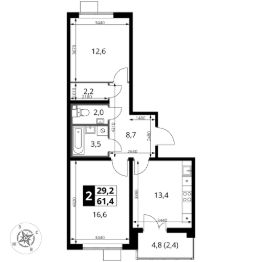 Продаётся 2-к квартира номер 598 общей площадью 61.4 кв.м. на 16-м этаже 25 этажного здания. Предчистовая отделка. Цена с учётом скидки.