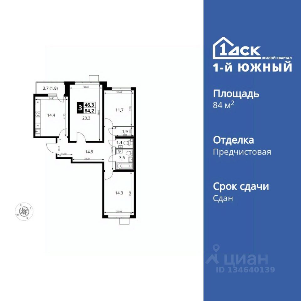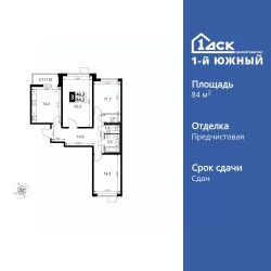 Продаётся 3-к квартира номер 643 общей площадью 84.2 кв.м. на 23-м этаже 25 этажного здания. Предчистовая отделка. Цена с учётом скидки.