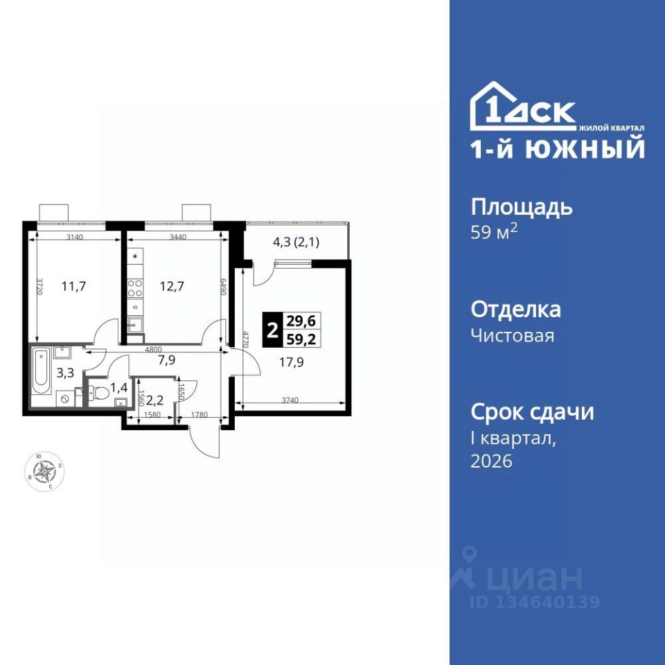 Продаётся 2-к квартира номер 62 общей площадью 59.1 кв.м. на 17-м этаже 25 этажного здания. Чистовая отделка. Цена с учётом скидки.