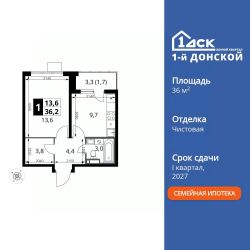 Продаётся 1-к квартира номер 166 общей площадью 36.2 кв.м. на 18-м этаже 24 этажного здания. Чистовая отделка.