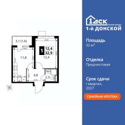 Продаётся 1-к квартира номер 413 общей площадью 32.9 кв.м. на 18-м этаже 24 этажного здания. Отделка Whitebox.