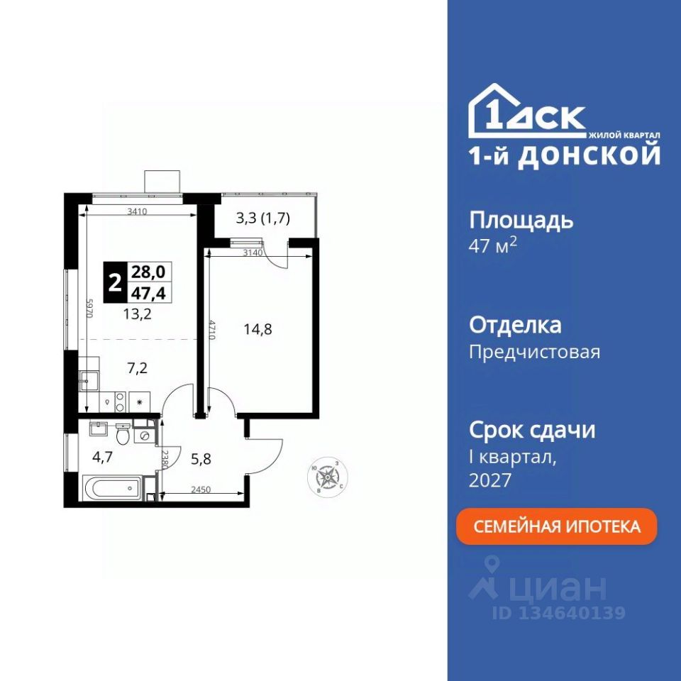 Продаётся 2-к квартира номер 802 общей площадью 47.4 кв.м. на 13-м этаже 24 этажного здания. Отделка Whitebox.
