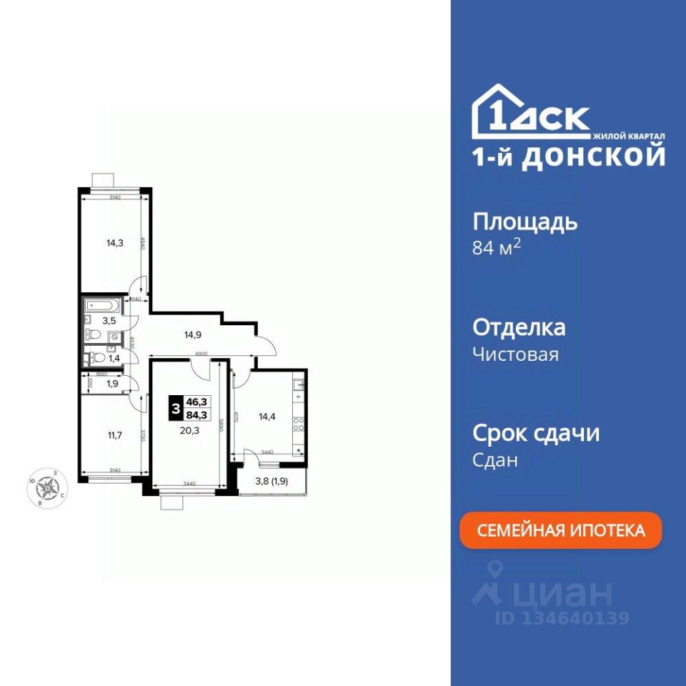 Продаётся 3-к квартира номер 125 общей площадью 84.3 кв.м. на 19-м этаже 24 этажного здания. Чистовая отделка. Цена с учётом скидки.