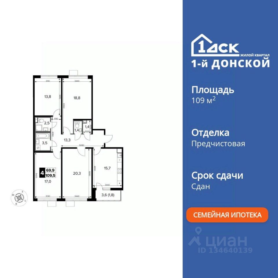 Продаётся 4-к квартира номер 238 общей площадью 109.5 кв.м. на 14-м этаже 24 этажного здания. Предчистовая отделка. Цена с учётом скидки.