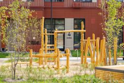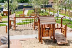 "1-й Донской": продуманная среда в развивающемся районе. На территории - муниципальные школа и 2 детских сада, поликлиника, торговый центр с площадью для мероприятий. Сеть пешеходных маршрутов ведёт к магазинам и кафе, отделённым от дорог зелёными фито-стенами.
