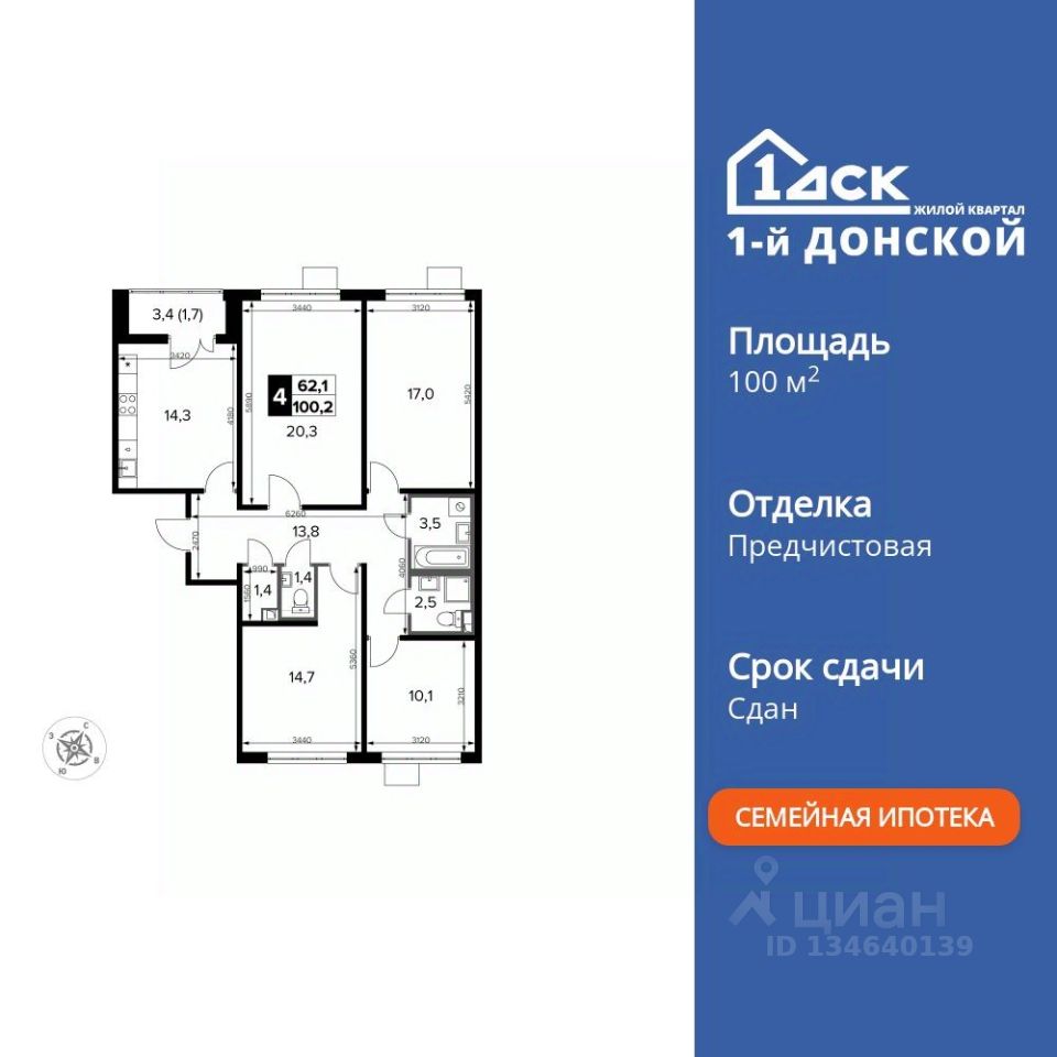 Продаётся 4-к квартира номер 440 общей площадью 100.7 кв.м. на 14-м этаже 20 этажного здания. Предчистовая отделка. Цена с учётом скидки.
