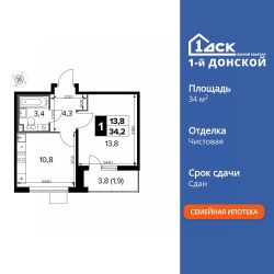 Продаётся 1-к квартира номер 498 общей площадью 34.2 кв.м. на 9-м этаже 12 этажного здания. Чистовая отделка. Цена с учётом скидки.