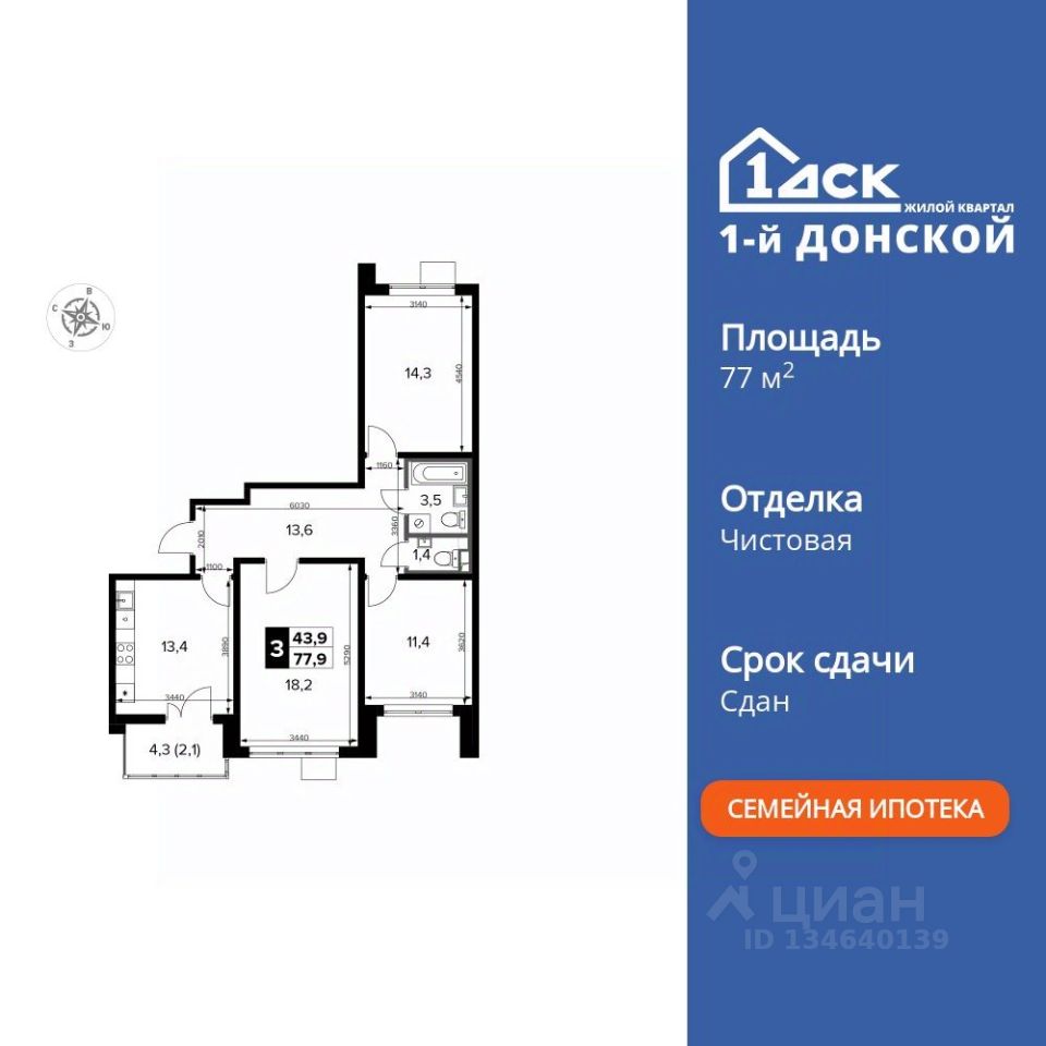 Продаётся 3-к квартира номер 247 общей площадью 77.9 кв.м. на 13-м этаже 24 этажного здания. Чистовая отделка. Цена с учётом скидки.