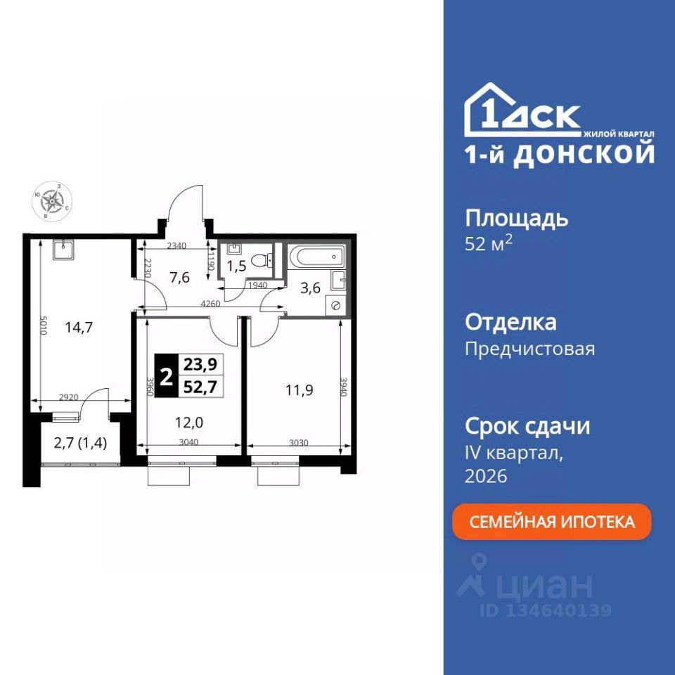 Продаётся 2-к квартира номер 253 общей площадью 52.7 кв.м. на 24-м этаже 24 этажного здания. Отделка Whitebox.