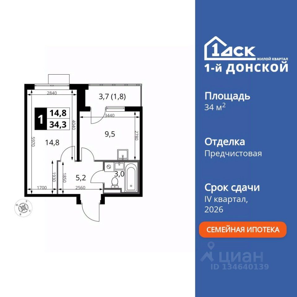 Продаётся 1-к квартира номер 184 общей площадью 34.3 кв.м. на 18-м этаже 24 этажного здания. Предчистовая отделка.