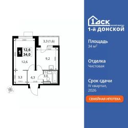 Продаётся 1-к квартира номер 308 общей площадью 34 кв.м. на 7-м этаже 24 этажного здания. Чистовая отделка.
