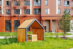 "1-й Донской": продуманная среда в развивающемся районе. На территории - муниципальные школа и 2 детских сада, поликлиника, торговый центр с площадью для мероприятий. Сеть пешеходных маршрутов ведёт к магазинам и кафе, отделённым от дорог зелёными фито-стенами.