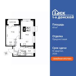 Продаётся 2-к квартира номер 606 общей площадью 49.7 кв.м. на 13-м этаже 24 этажного здания. Отделка Whitebox.