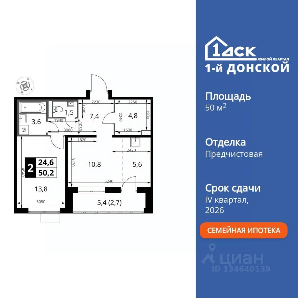 Продаётся 2-к квартира номер 940 общей площадью 50.2 кв.м. на 24-м этаже 24 этажного здания. Предчистовая отделка.