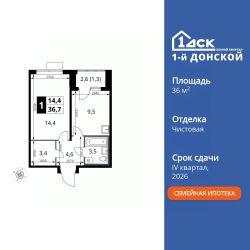 Продаётся 1-к квартира номер 889 общей площадью 36.7 кв.м. на 18-м этаже 24 этажного здания. Чистовая отделка.
