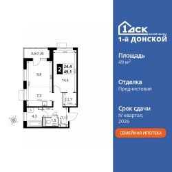 Продаётся 2-к квартира номер 870 общей площадью 49.1 кв.м. на 16-м этаже 24 этажного здания. Предчистовая отделка.