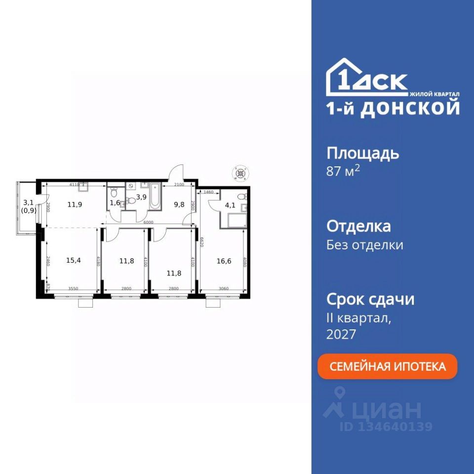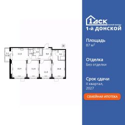 Продаётся 4-к квартира номер 57 общей площадью 87.8 кв.м. на 7-м этаже 24 этажного здания. Без отделки.