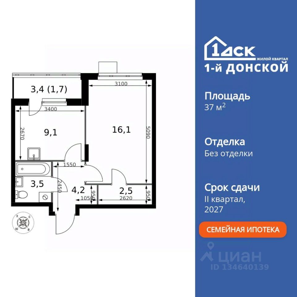 Продаётся 1-к квартира номер 71 общей площадью 37.1 кв.м. на 8-м этаже 24 этажного здания. Без отделки.
