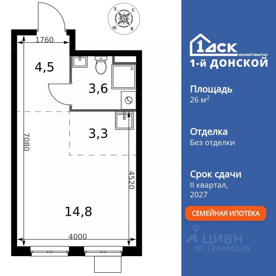 Продаётся квартира-студия номер 155 общей площадью 26.2 кв.м. на 16-м этаже 24 этажного здания. Без отделки.