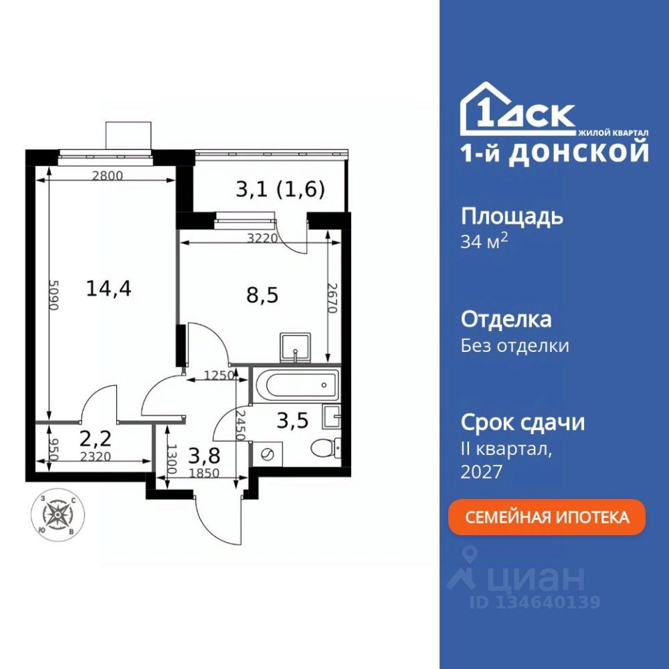 Продаётся 1-к квартира номер 171 общей площадью 34 кв.м. на 17-м этаже 24 этажного здания. Без отделки.