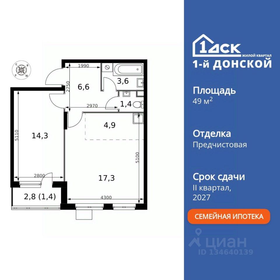 Продаётся 2-к квартира номер 503 общей площадью 49.5 кв.м. на 22-м этаже 24 этажного здания. Предчистовая отделка.