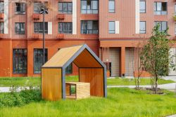 "1-й Донской": продуманная среда в развивающемся районе. На территории - муниципальные школа и 2 детских сада, поликлиника, торговый центр с площадью для мероприятий. Сеть пешеходных маршрутов ведёт к магазинам и кафе, отделённым от дорог зелёными фито-стенами.