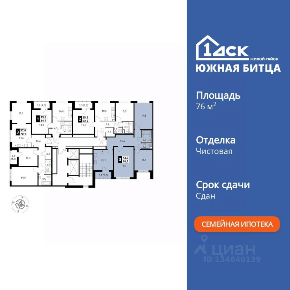 Продаётся 3-к квартира номер 160 общей площадью 76.1 кв.м. на 21-м этаже 22 этажного здания. Чистовая отделка. Цена с учётом скидки.