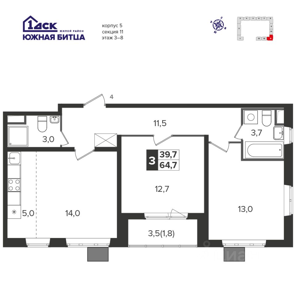Продаётся 3-к квартира номер 1220 общей площадью 64.1 кв.м. на 3-м этаже 21 этажного здания. Без отделки. Цена с учётом скидки.