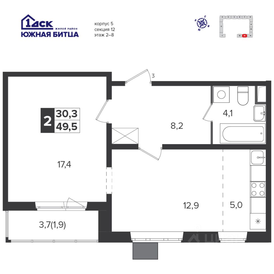 Продаётся 2-к квартира номер 1333 общей площадью 49.3 кв.м. на 2-м этаже 21 этажного здания. Без отделки. Цена с учётом скидки.