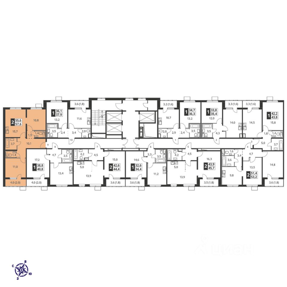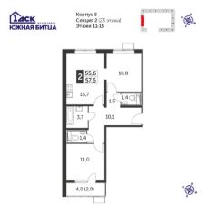 Продаётся 2-к квартира номер 213 общей площадью 57.3 кв.м. на 11-м этаже 23 этажного здания. Без отделки. Цена с учётом скидки.