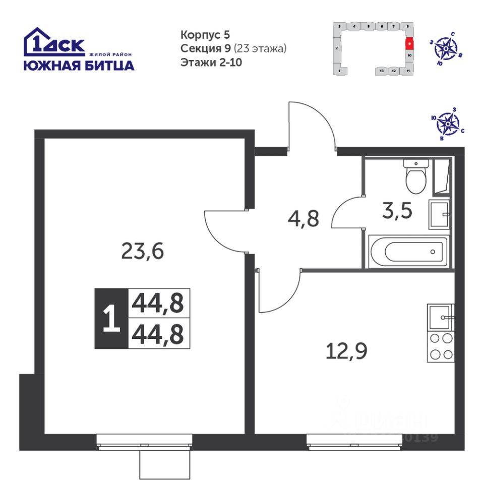 Продаётся 1-к квартира номер 1065 общей площадью 44.7 кв.м. на 9-м этаже 23 этажного здания. Без отделки. Цена с учётом скидки.