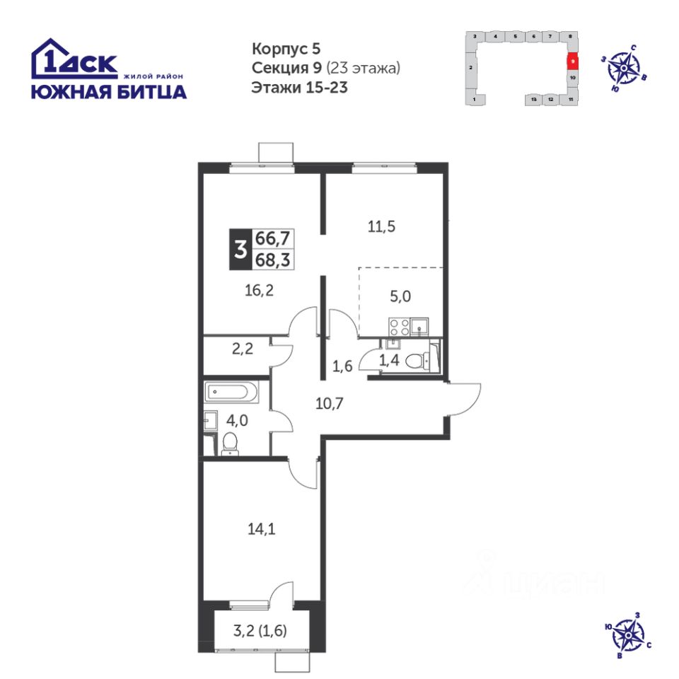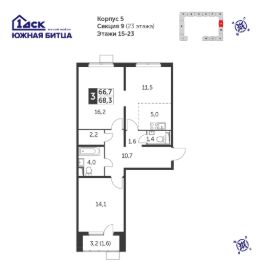 Продаётся 3-к квартира номер 1114 общей площадью 67.9 кв.м. на 21-м этаже 23 этажного здания. Без отделки. Цена с учётом скидки.