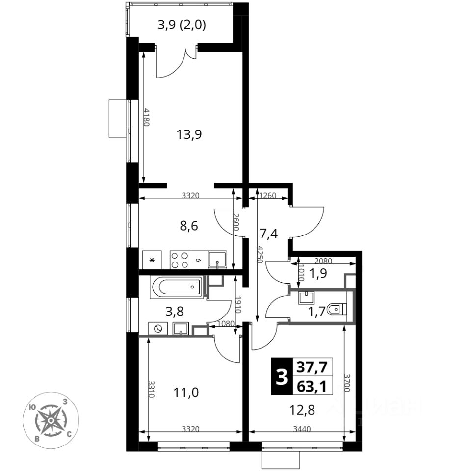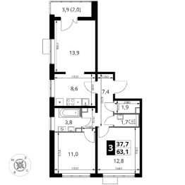 Продаётся 3-к квартира номер 72 общей площадью 63.6 кв.м. на 12-м этаже 22 этажного здания. Отделка Whitebox.
