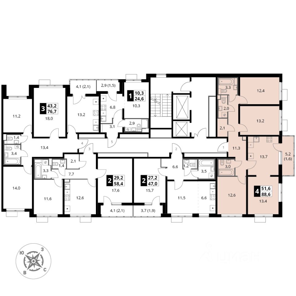 Продаётся 4-к квартира номер 542 общей площадью 89 кв.м. на 6-м этаже 22 этажного здания. Отделка Whitebox.