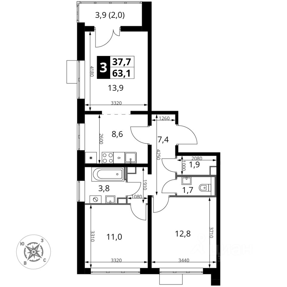 Продаётся 3-к квартира номер 784 общей площадью 63.6 кв.м. на 21-м этаже 22 этажного здания. Отделка Whitebox.