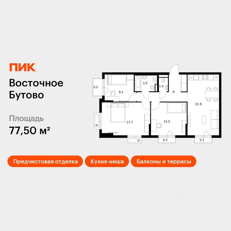 Продаётся 3-комн. квартира площадью 77,5 кв.м на 9 этаже 17 этажного дома (Корпус 48, Секция 2) проекта ПИК Восточное Бутово. Светлый просторный подъезд на уровне земли, функциональная планировка, большие окна, предчистовая отделка.