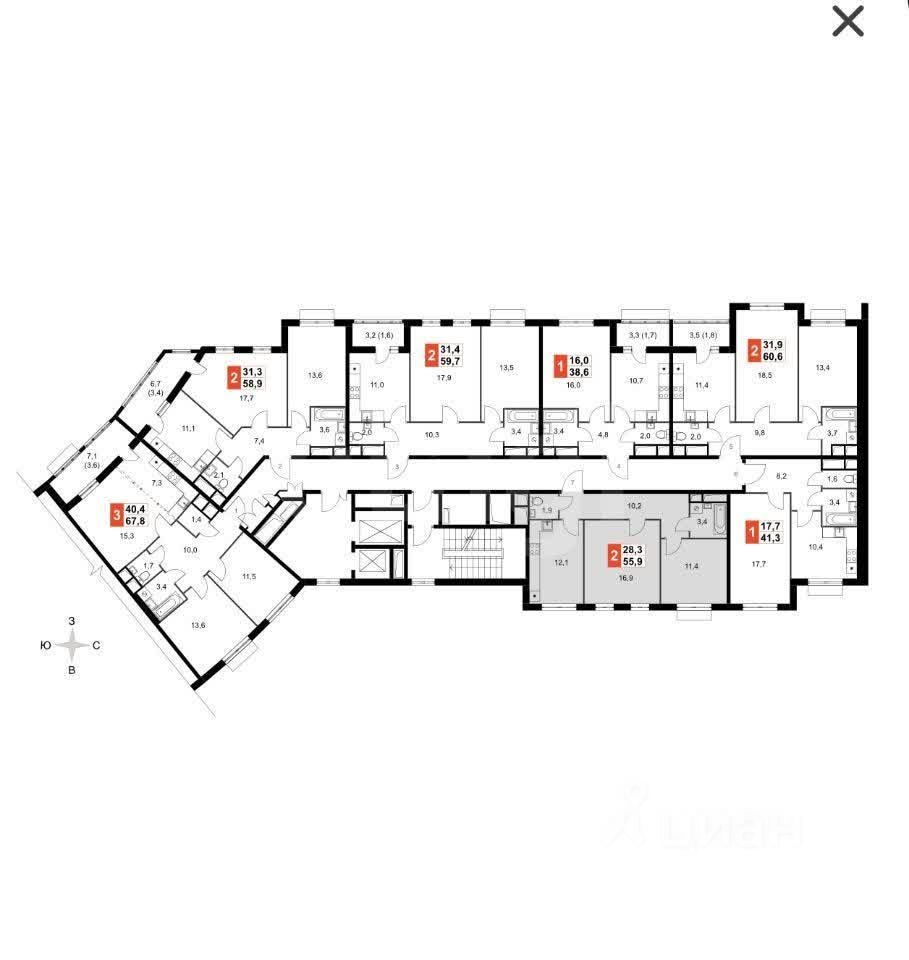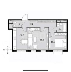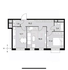 Площадь: общая — 56 м2, жилая — 28,3 м2, кухня — 12,1 м2.