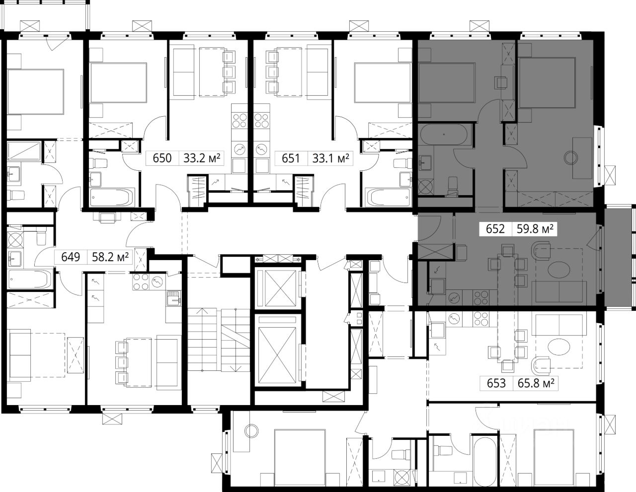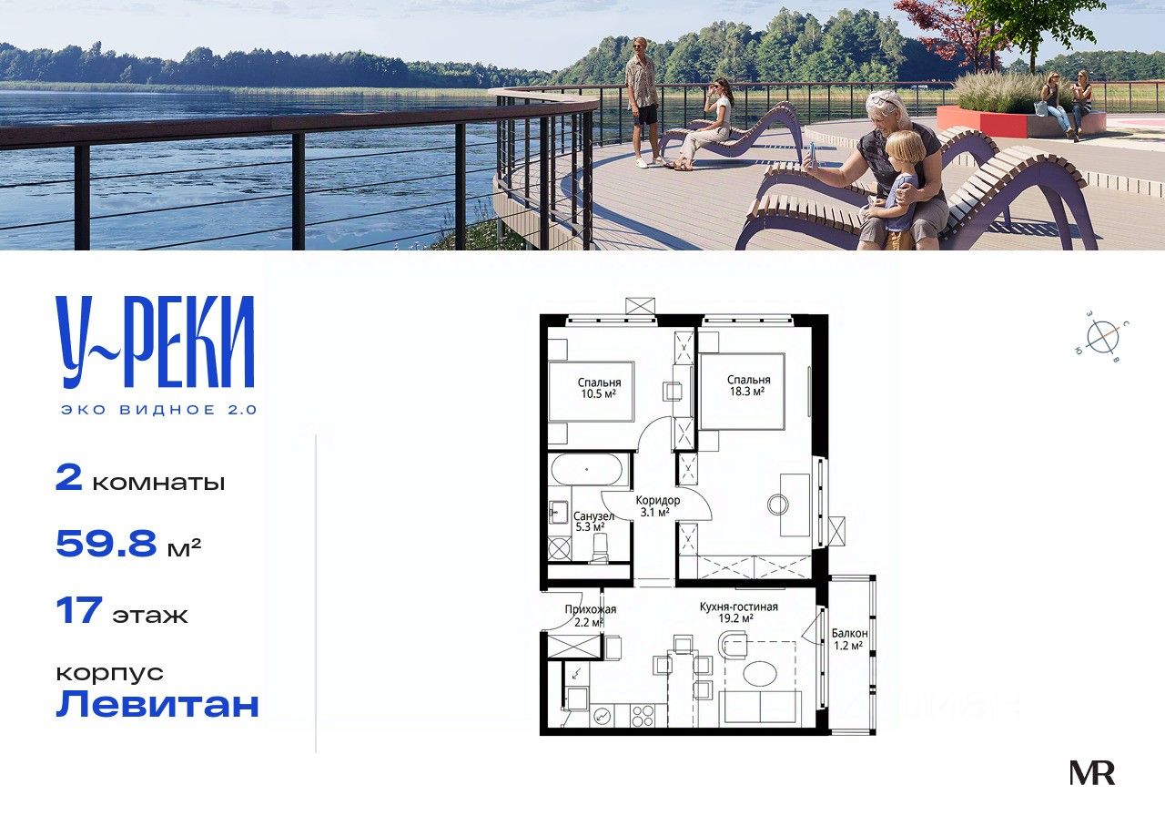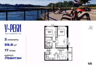 Продаётся 2-комнатная квартира общей площадью 59.80 м² с чистовой отделкой в ЖК "У реки. Эко Видное 2.0" на 17-м этаже 17 этажного корпуса Левитан.