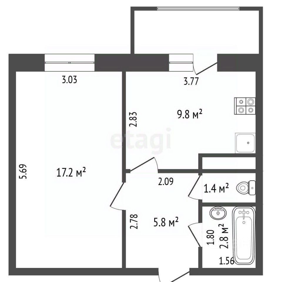 Однокомнатная с большой кухней 9.8 кв. м и комнатой-гостиной 17.2 кв. м, общей площадью более 40 кв. м
