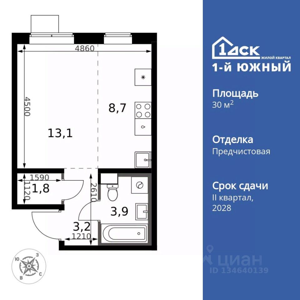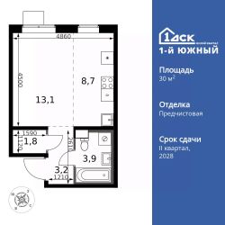 Продаётся квартира-студия номер 14 общей площадью 30.7 кв.м. на 4-м этаже 23 этажного здания. Предчистовая отделка. Цена с учётом скидки.